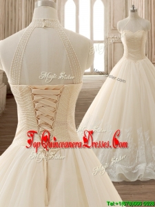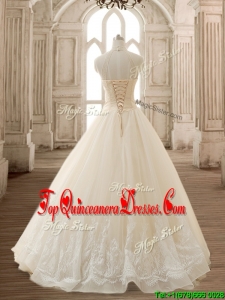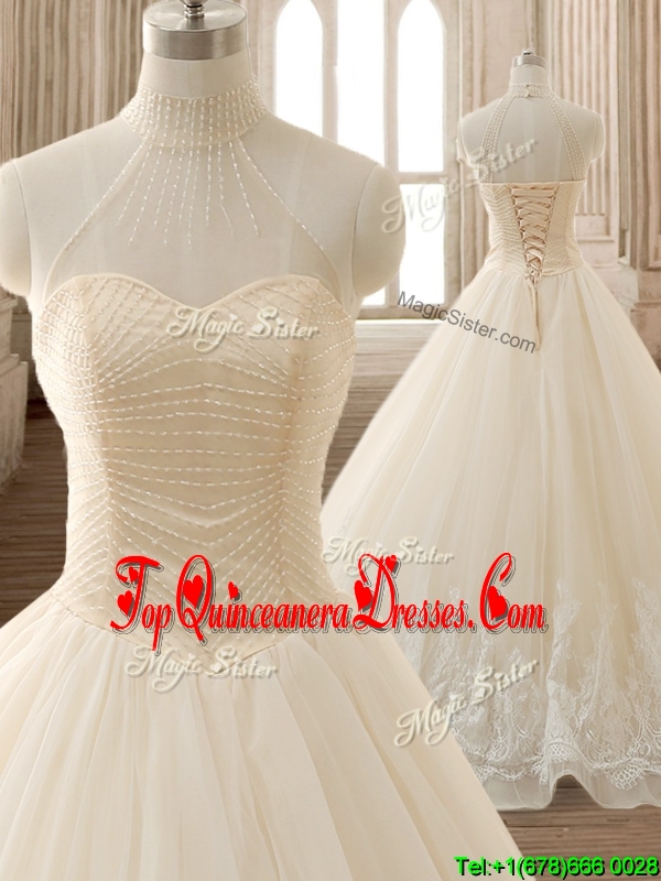See Through High Neck Champagne Quinceanera Dress with Beading and Appliques