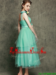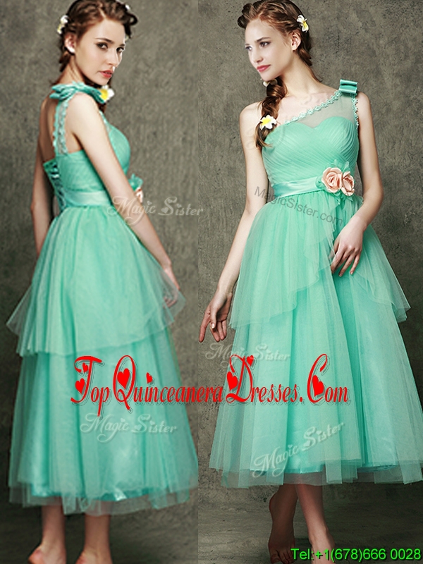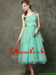 See Through One Shoulder Quinceanera Dama Dress with Bowknot and Hand Made Flowers