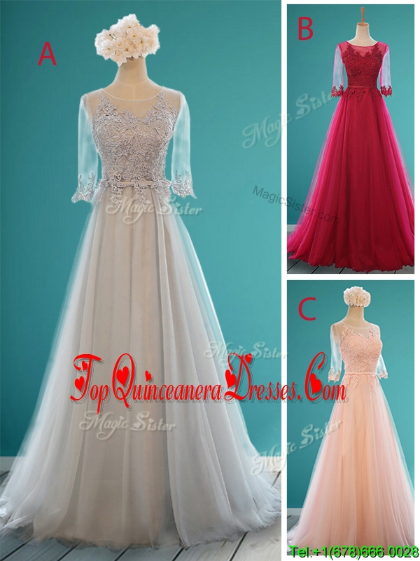 See Through Scoop Half Sleeves Quinceanera Dama Dress with Appliques and Belt