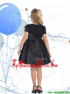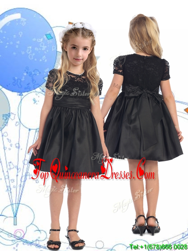 See Through Scoop Short Sleeves Lace and Belt New Arrival Kid Pageant Dresses in Black