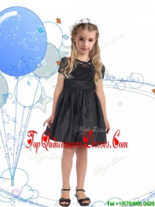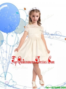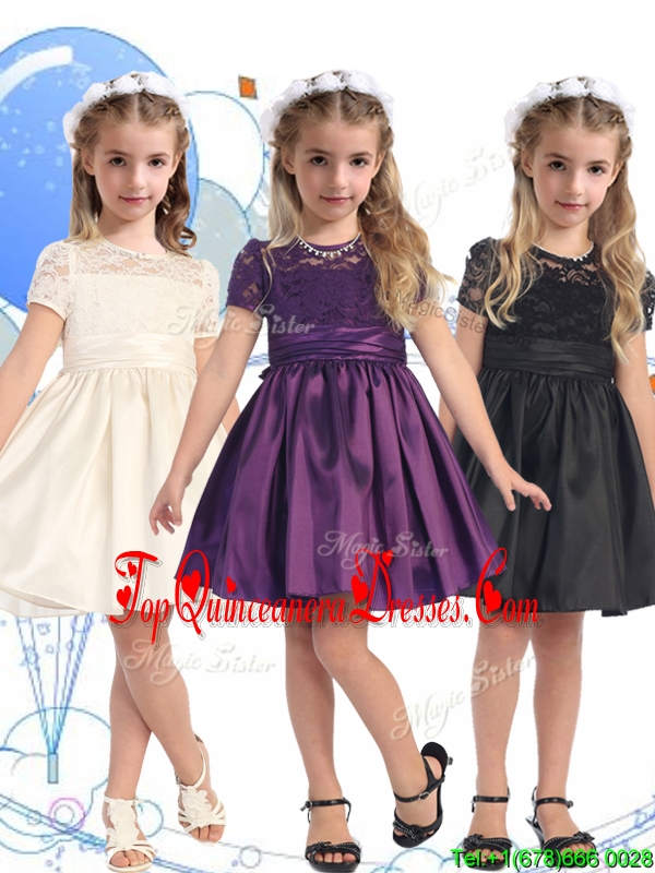 See Through Scoop Short Sleeves New Arrival Kid Pageant Dresses with Lace and Belt