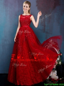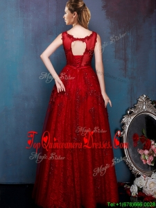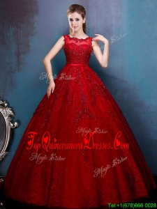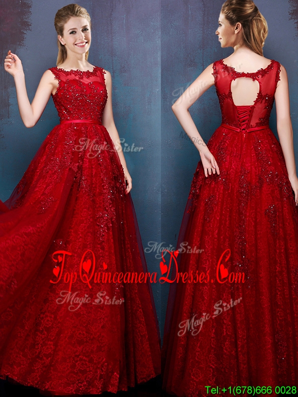 See Through Scoop Wine Red Dama Dress with Beading and Appliques