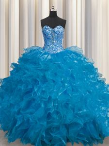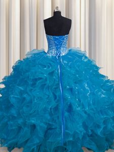 See Through Teal Lace Up Dama Dress Beading and Ruffles Sleeveless Floor Length