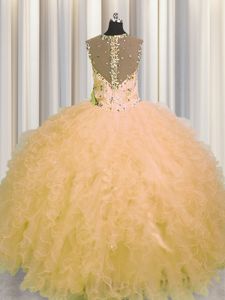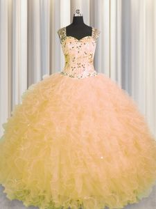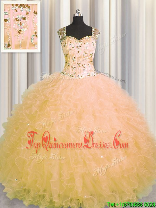 See Through Zipper Up Gold Straps Neckline Beading and Ruffles Sweet 16 Dresses Sleeveless Zipper