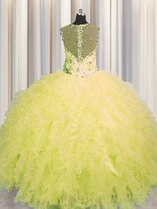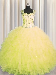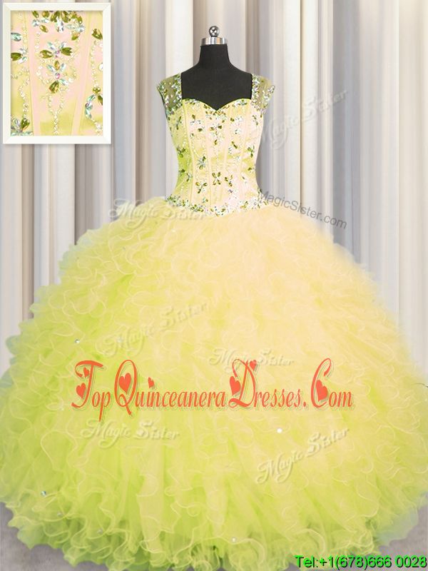 See Through Zipper Up Yellow Ball Gowns Straps Sleeveless Tulle Floor Length Zipper Beading and Ruffles Quince Ball Gowns