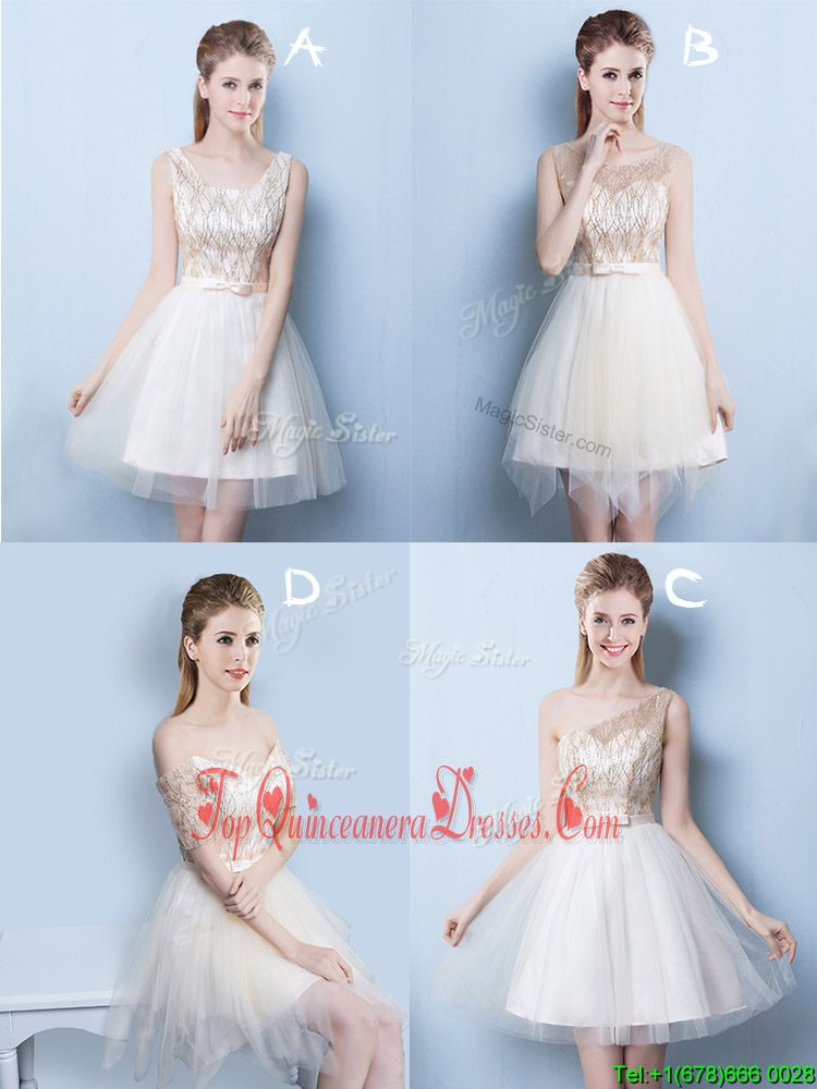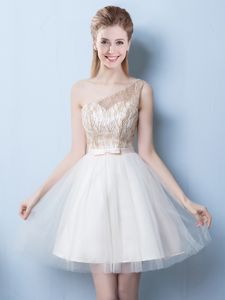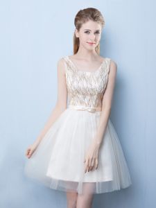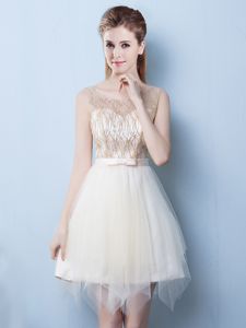 Sequins A-line Quinceanera Court Dresses Champagne Square Tulle Sleeveless Mini Length Lace Up