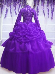 Sequins Pick Ups Purple Long Sleeves Organza Zipper Ball Gown Prom Dress for Military Ball and Sweet 16 and Quinceanera