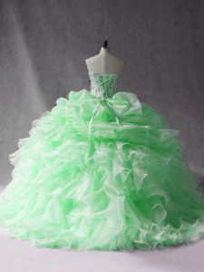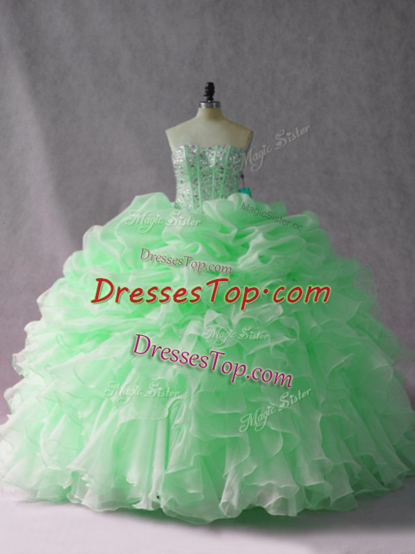 Sexy Apple Green Lace Up Strapless Beading and Ruffles Quinceanera Gowns Organza Sleeveless Brush Train