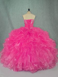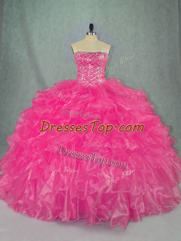 Sexy Beading and Ruffles Vestidos de Quinceanera Hot Pink Lace Up Sleeveless Floor Length