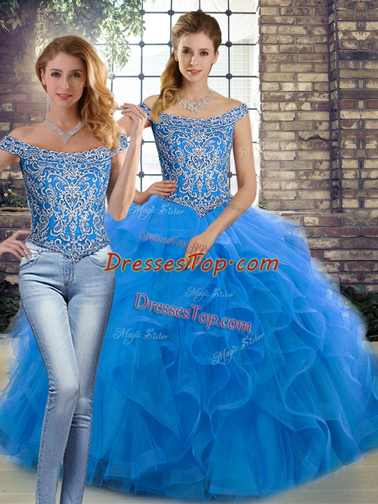 Sexy Blue Sleeveless Beading and Ruffles Lace Up Quinceanera Dresses