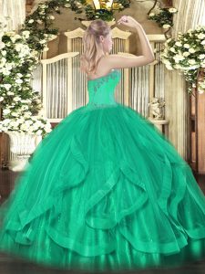 Sexy Sleeveless Organza Lace Up Quince Ball Gowns in Olive Green with Beading and Ruffles