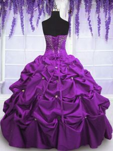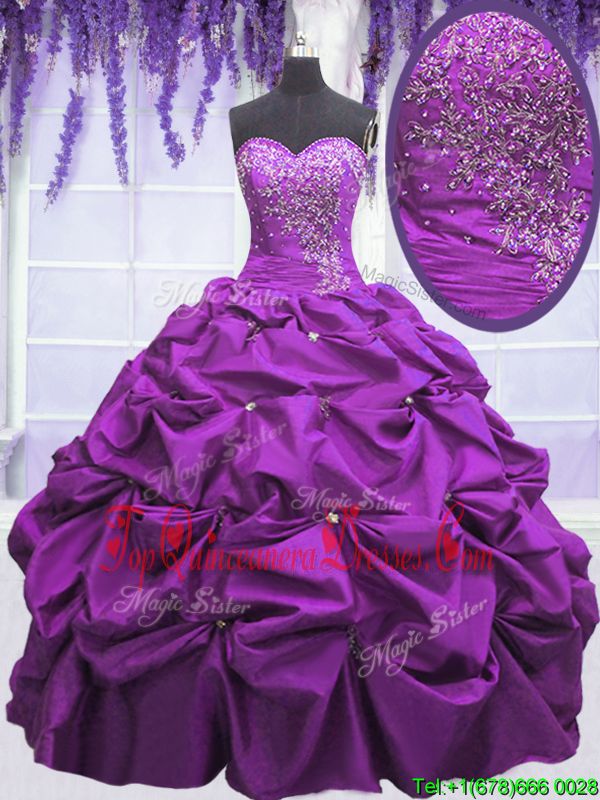 Sexy Sweetheart Sleeveless Quince Ball Gowns Floor Length Appliques and Pick Ups Purple Taffeta