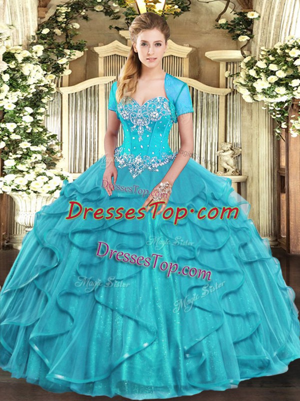 Shining Aqua Blue Ball Gowns Sweetheart Sleeveless Tulle Floor Length Lace Up Beading and Ruffles Quinceanera Dress