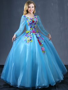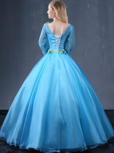 Shining Baby Blue Long Sleeves Appliques Floor Length Ball Gown Prom Dress