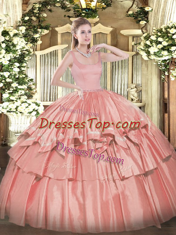 Shining Coral Red Taffeta Zipper Straps Sleeveless Floor Length Sweet 16 Dress Beading and Ruffled Layers