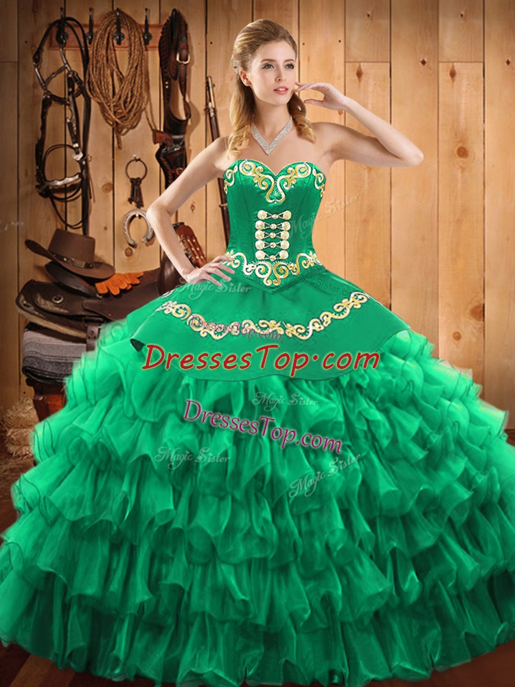 Shining Floor Length Lace Up Quince Ball Gowns Green for Military Ball and Sweet 16 and Quinceanera with Embroidery and Ruffled Layers