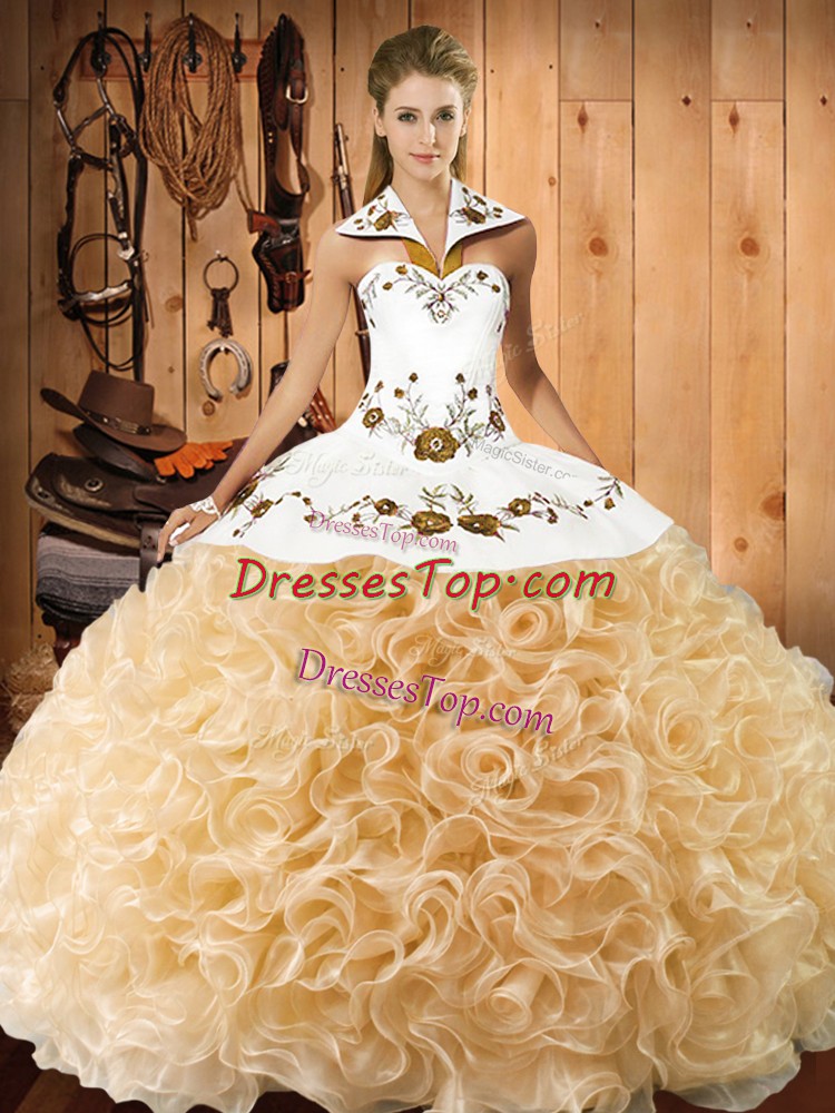 Shining Halter Top Sleeveless Lace Up Sweet 16 Quinceanera Dress Champagne Fabric With Rolling Flowers