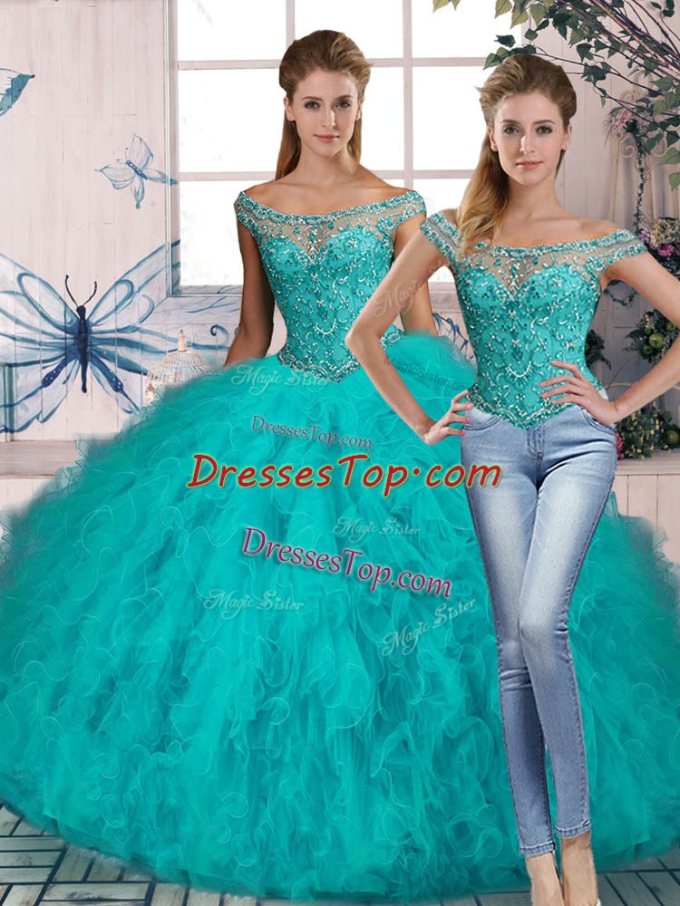 Shining Off The Shoulder Sleeveless Tulle Sweet 16 Dress Beading and Ruffles Brush Train Lace Up
