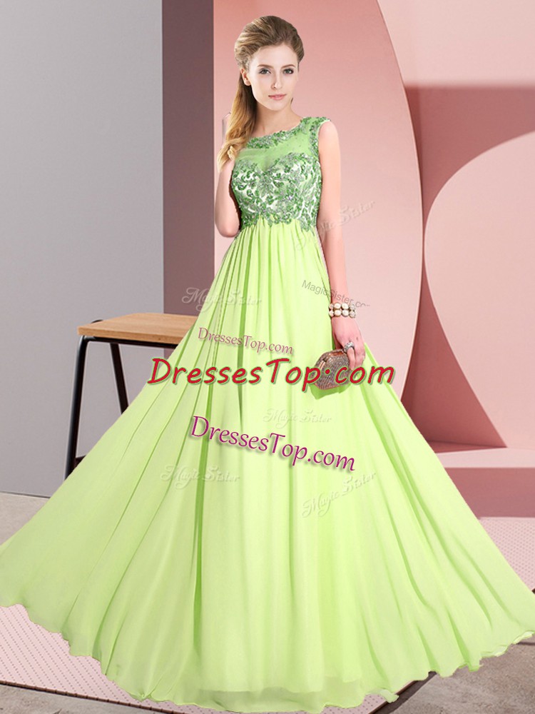 Shining Sleeveless Chiffon Floor Length Backless Vestidos de Damas in Yellow Green with Beading and Appliques