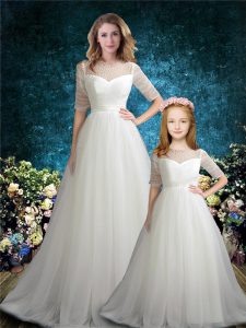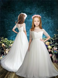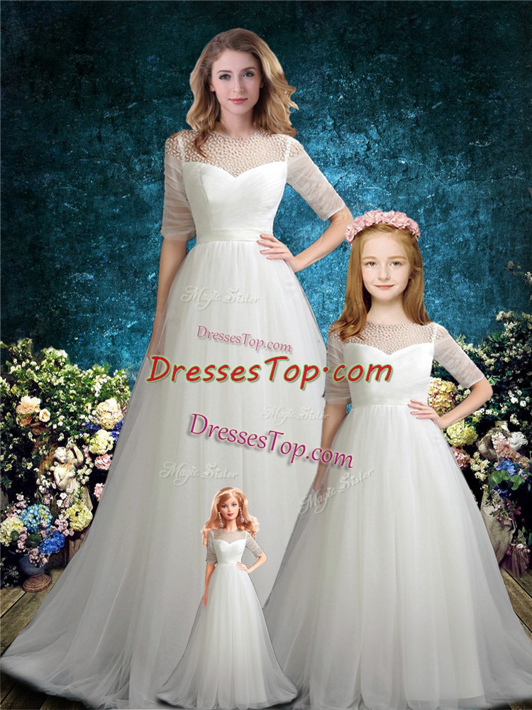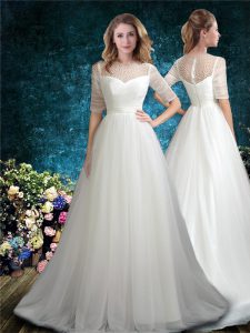 Shining Tulle Scoop Half Sleeves Brush Train Zipper Beading Ball Gown Prom Dress in White
