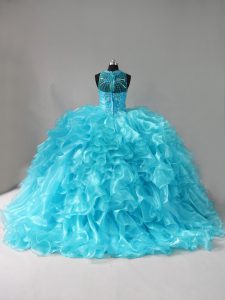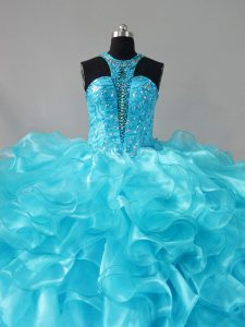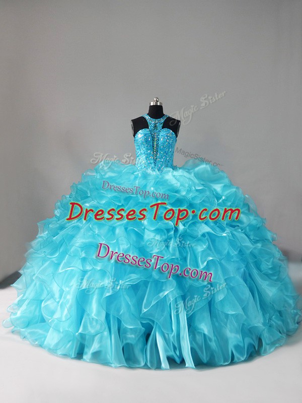 Simple Aqua Blue Halter Top Lace Up Beading and Ruffles Sweet 16 Dress Brush Train Sleeveless