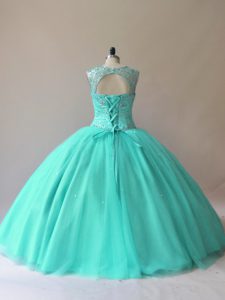 Simple Aqua Blue Tulle Lace Up Quince Ball Gowns Sleeveless Floor Length Beading