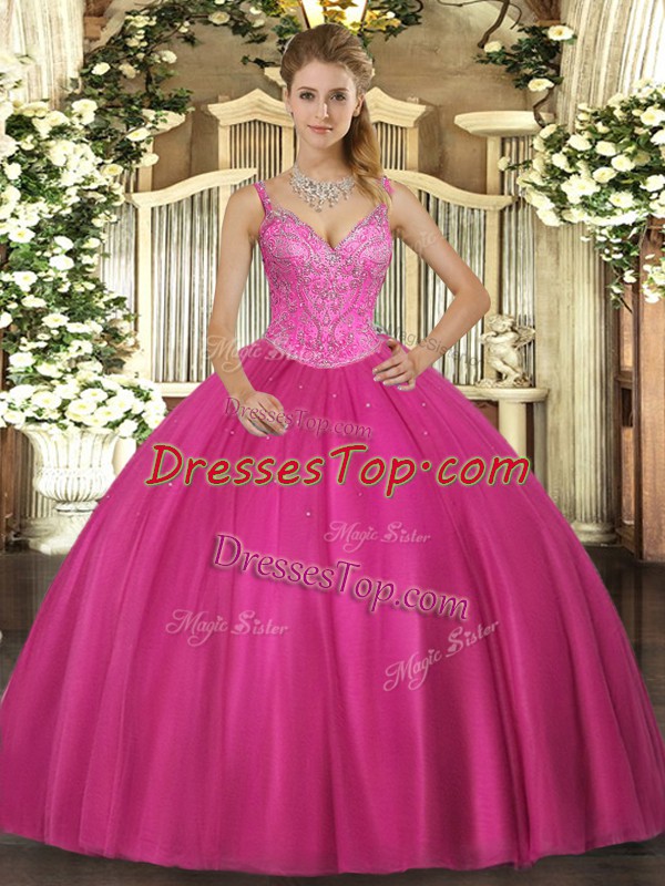 Simple Ball Gowns Sweet 16 Dresses Fuchsia V-neck Tulle Sleeveless Floor Length Lace Up
