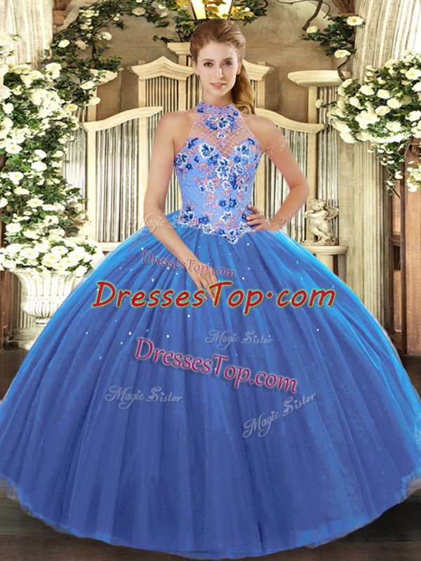 Simple Blue Sweet 16 Quinceanera Dress Military Ball and Sweet 16 and Quinceanera with Embroidery Halter Top Sleeveless Lace Up