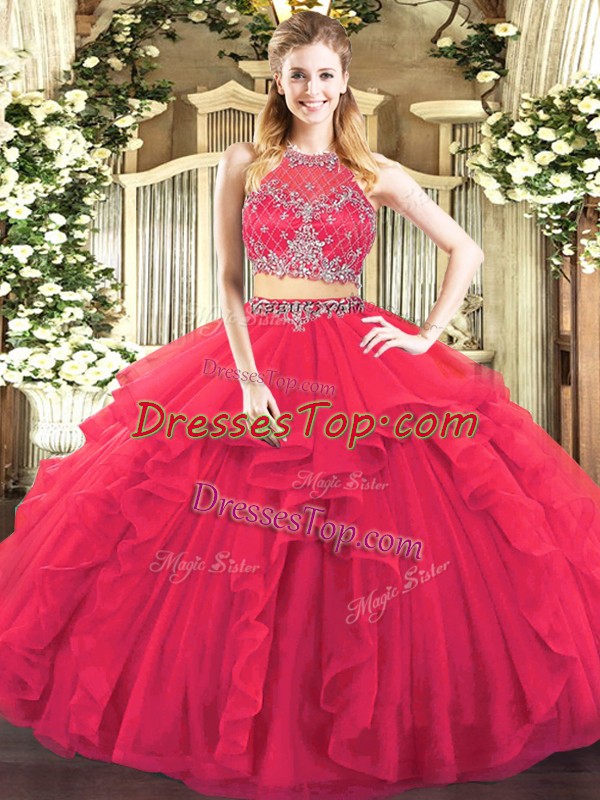 Simple Coral Red 15 Quinceanera Dress Military Ball and Sweet 16 and Quinceanera with Beading and Ruffles Scoop Sleeveless Zipper