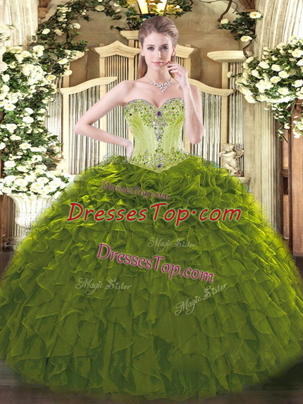 Simple Floor Length Lace Up Sweet 16 Quinceanera Dress Olive Green for Sweet 16 and Quinceanera with Beading and Ruffles