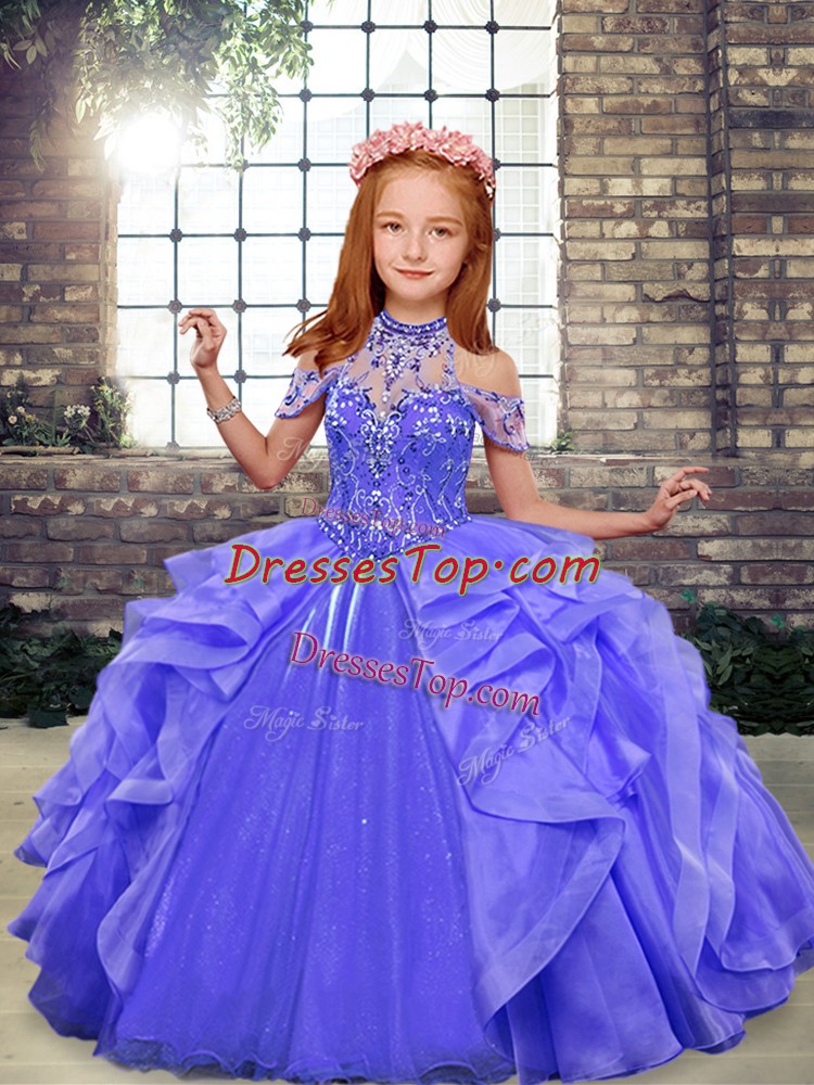 Simple Halter Top Sleeveless Organza Pageant Gowns For Girls Beading and Ruffles Lace Up