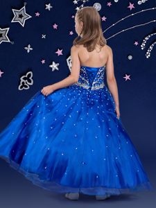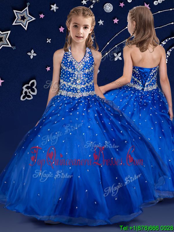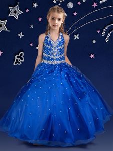 Simple Halter Top Sleeveless Pageant Dress Toddler Floor Length Beading Royal Blue Organza