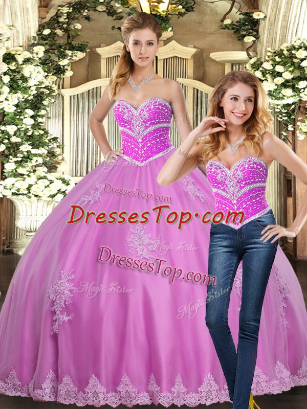 Simple Lilac Lace Up Quince Ball Gowns Beading and Appliques Sleeveless Floor Length