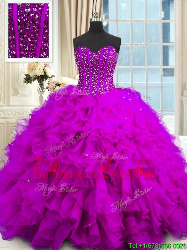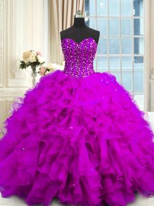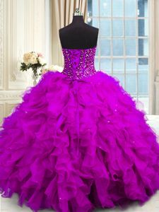 Simple Purple Sleeveless Beading and Ruffles and Sequins Floor Length Damas Dress