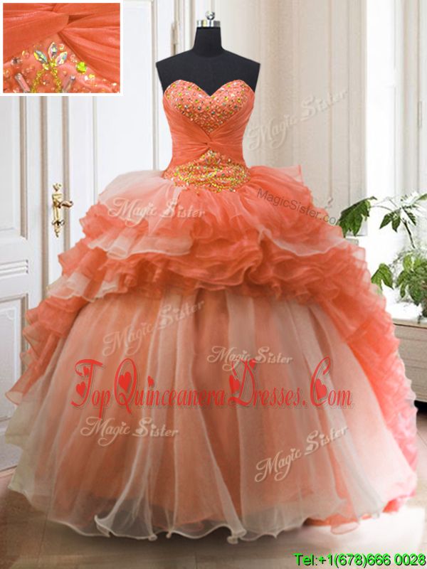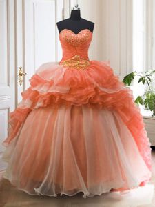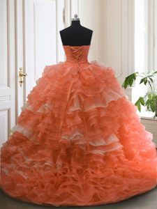 Simple Ruffled Sweep Train Ball Gowns Ball Gown Prom Dress Orange Red Sweetheart Organza Sleeveless With Train Lace Up