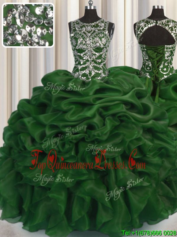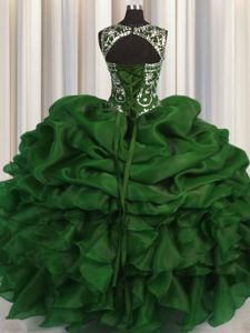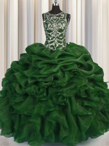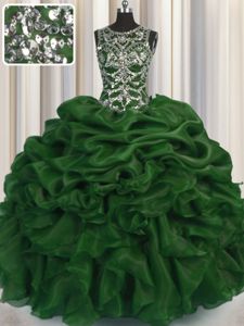 Simple Scoop See Through Dark Green Organza Lace Up Quinceanera Gown Sleeveless Floor Length Beading and Pick Ups