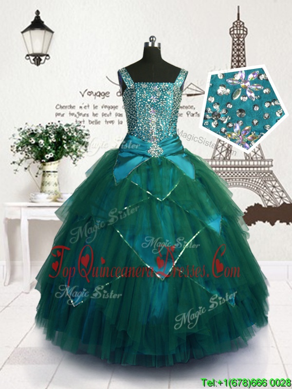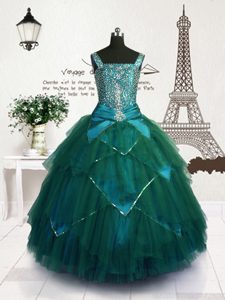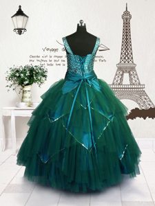Simple Sleeveless Floor Length Beading and Belt Lace Up Child Pageant Dress with Teal