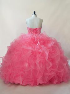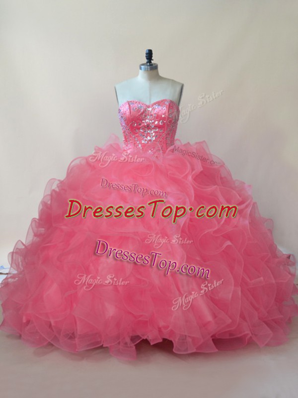 Simple Sweetheart Sleeveless Ball Gown Prom Dress Floor Length Beading and Ruffles Coral Red Organza