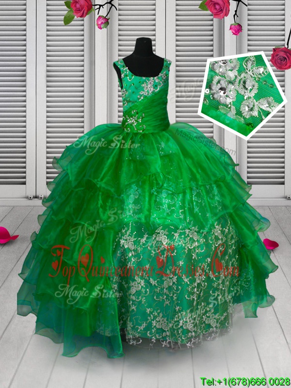 Simple Teal Organza Lace Up Straps Sleeveless Floor Length Little Girls Pageant Dress Beading and Ruffles