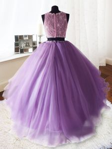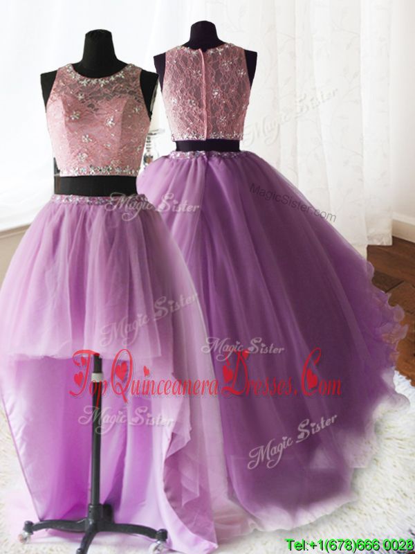Simple Three Piece Scoop With Train Lilac Sweet 16 Quinceanera Dress Organza and Tulle and Lace Brush Train Sleeveless Beading and Lace and Ruffles