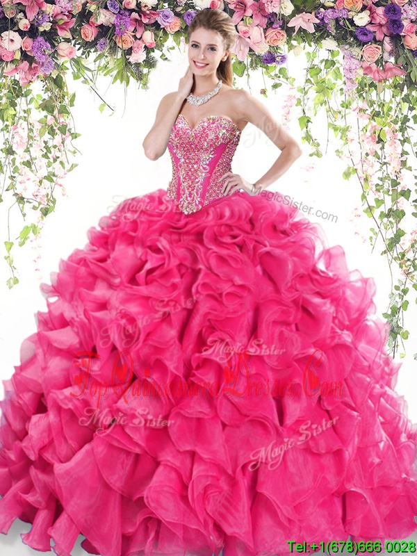 Sleeveless Beading and Ruffles Lace Up Quinceanera Dress with Hot Pink Sweep Train