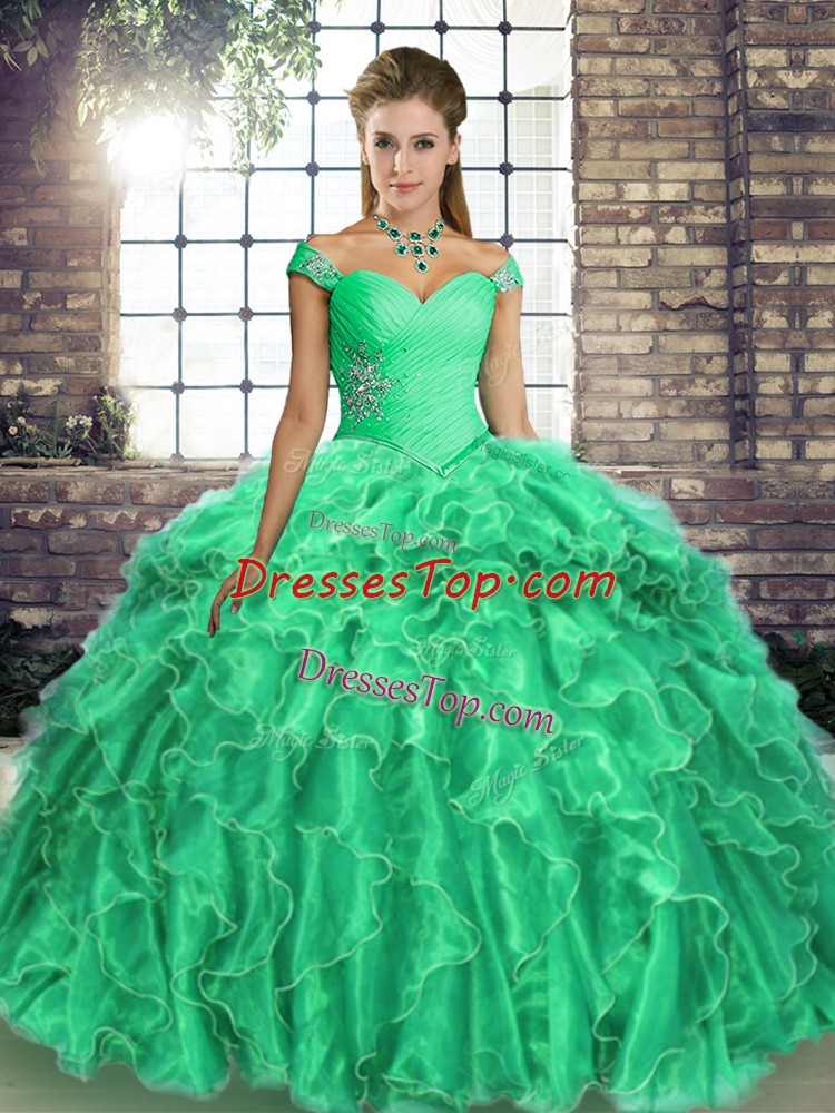Sleeveless Beading and Ruffles Lace Up Quinceanera Dress with Turquoise Brush Train