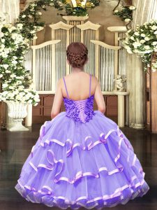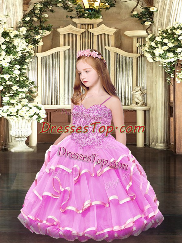 Sleeveless Floor Length Appliques and Ruffled Layers Lace Up Little Girls Pageant Dress Wholesale with Rose Pink