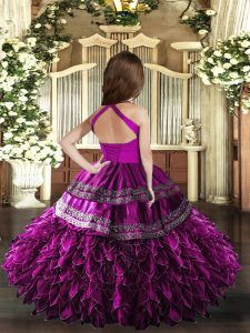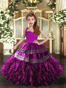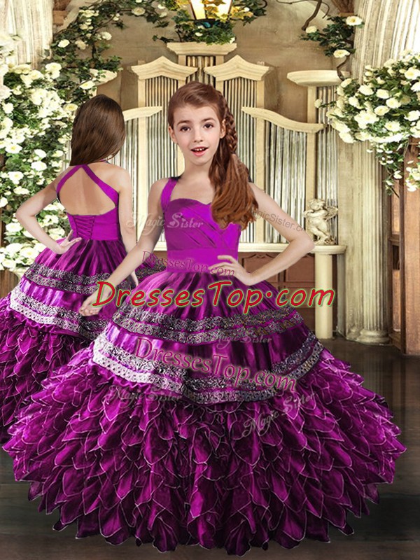 Sleeveless Floor Length Appliques and Ruffles Lace Up Kids Pageant Dress with Purple
