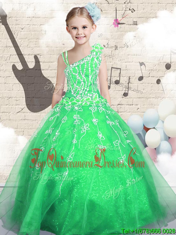 Sleeveless Floor Length Beading and Appliques and Hand Made Flower Lace Up Child Pageant Dress with Green