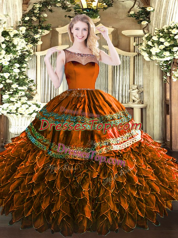 Sleeveless Floor Length Beading and Appliques and Ruffles Zipper Ball Gown Prom Dress with Rust Red
