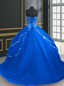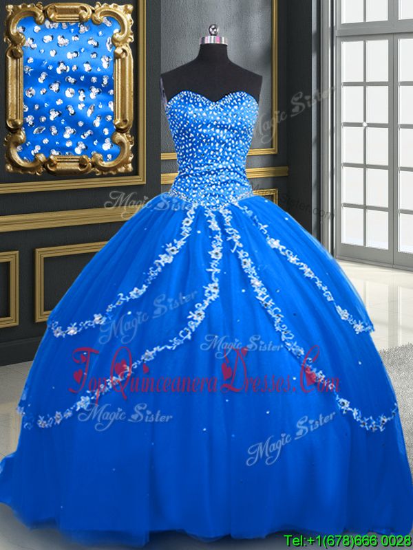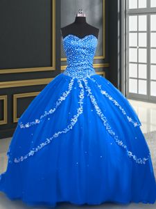 Sleeveless Floor Length Beading and Appliques and Ruffles Zipper Sweet 16 Quinceanera Dress with Blue