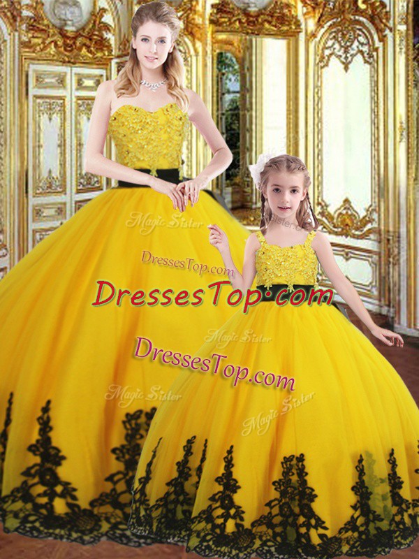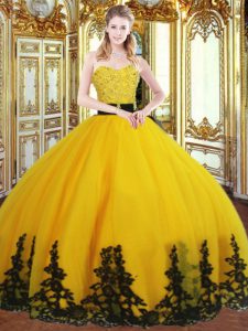 Sleeveless Floor Length Beading and Appliques Lace Up 15 Quinceanera Dress with Gold