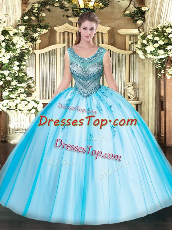 Sleeveless Floor Length Beading and Appliques Lace Up Quince Ball Gowns with Baby Blue