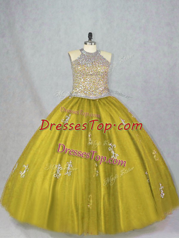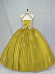 Sleeveless Floor Length Beading and Appliques Lace Up Sweet 16 Dress with Olive Green